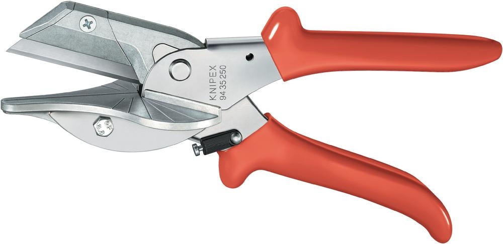 Sehr praktisches Werkzeug zum Schneiden unserer Klemmleisten. Zum quetschfreien Schneiden von Kunststoff- und Gummiprofilen. Auswechselbare Schneidauflage mit Anschlagwinkel zum winkligen Schneiden 45/60/75/90° · Auswechselbares, handelsübliches Messer, mit Öffnungsfeder und Sperrklinke.