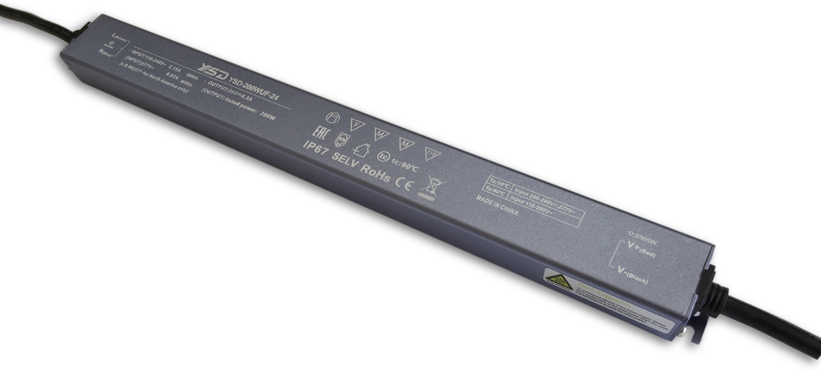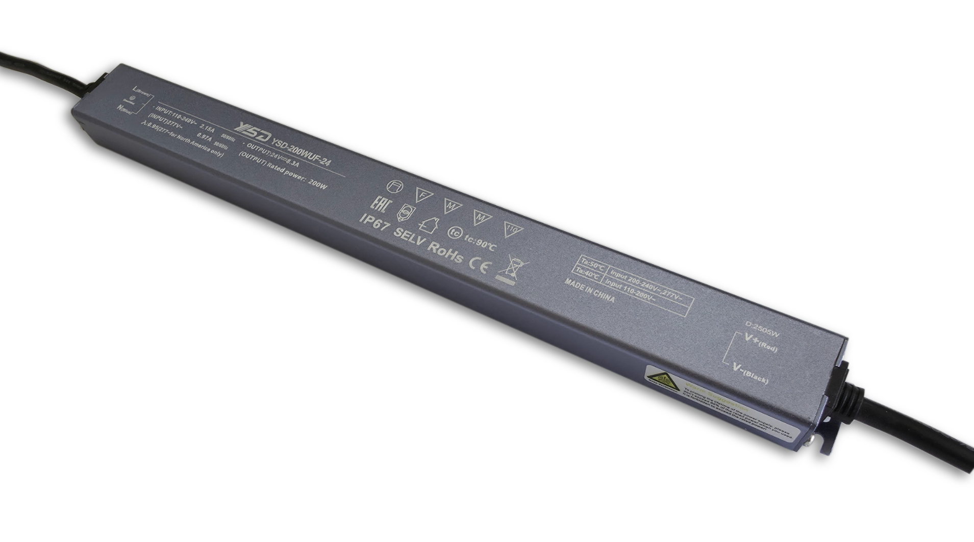 Das Modell YSD-200WUF-24 liefert konstante 24 V DC bei satten 200 W und bis zu 8,3 A – perfekt für leuchtstarke LED-Systeme.