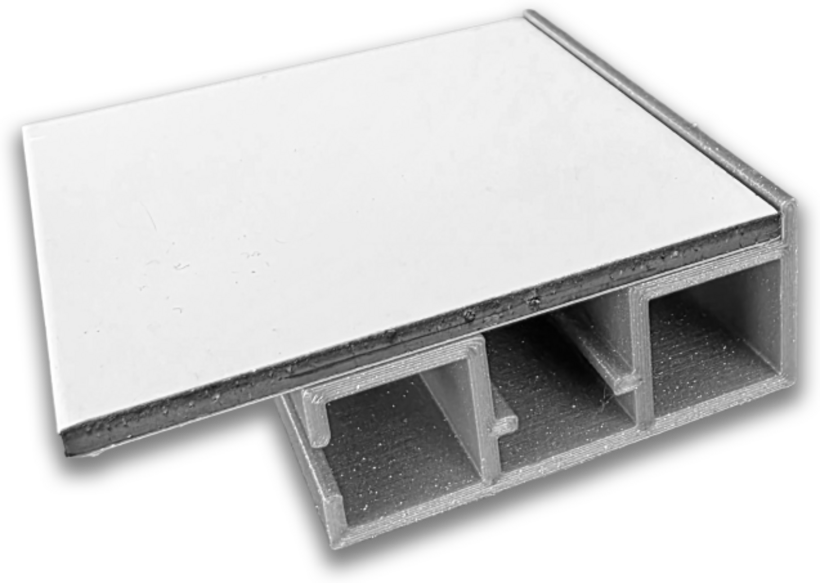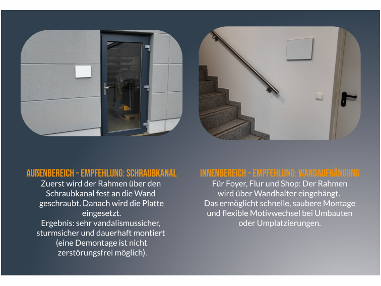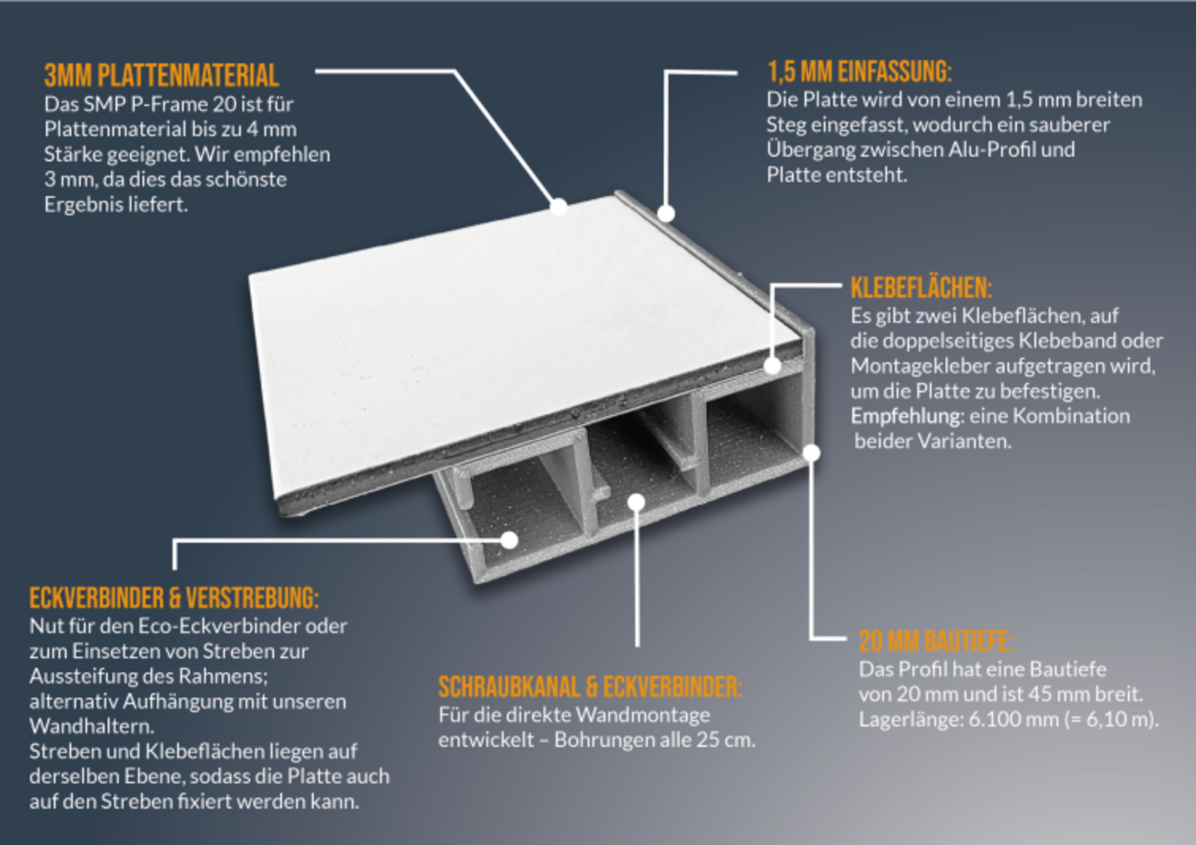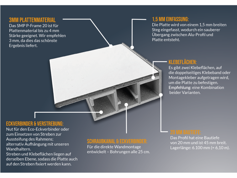 Die Platten werden sauber im Rahmen eingefasst. Das Profil kann zusätzlich verstrebt werden. Es gibt zwei Klebeflächen für 1,5cm breites doppelseitges Klebeband. Für große Anwendung kann die Platte auch auf den Streben verklebt werden.